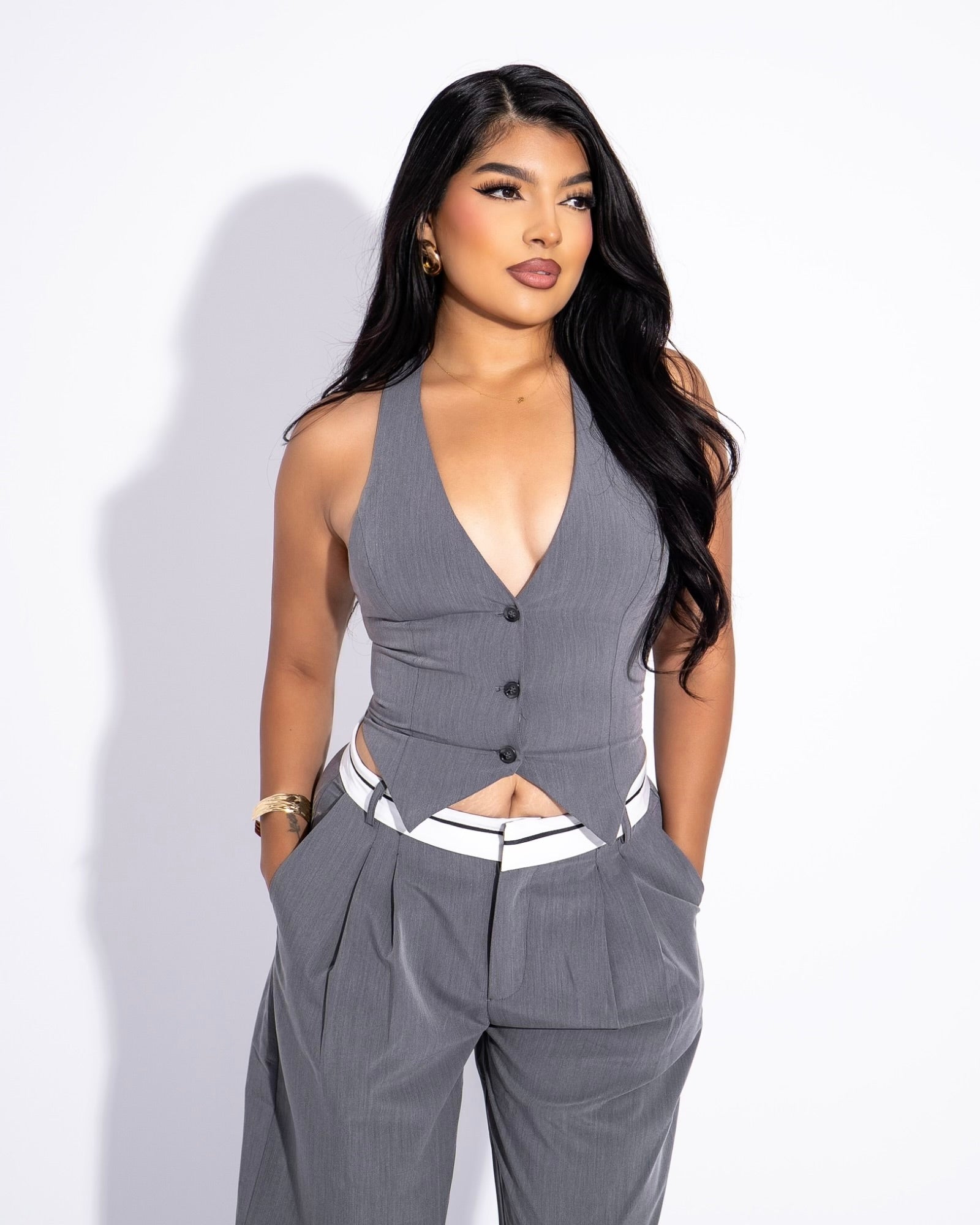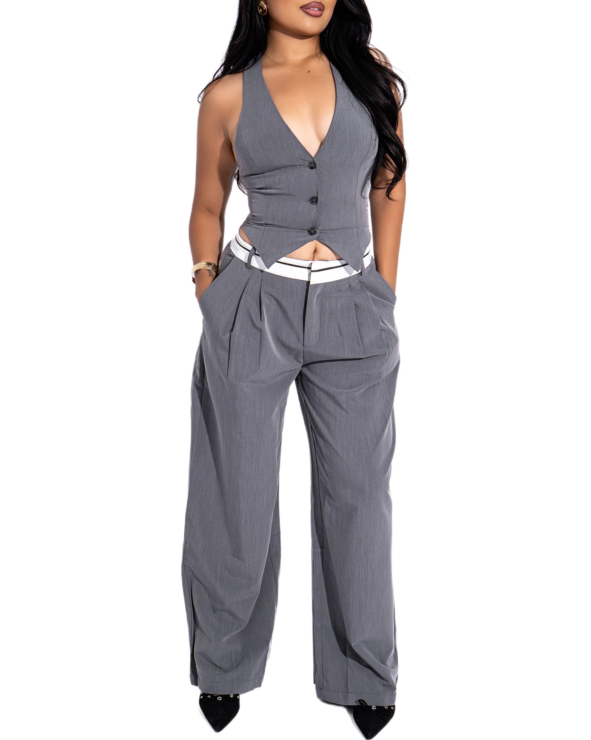 Business baddie vibes with this halter vest & wide pant set